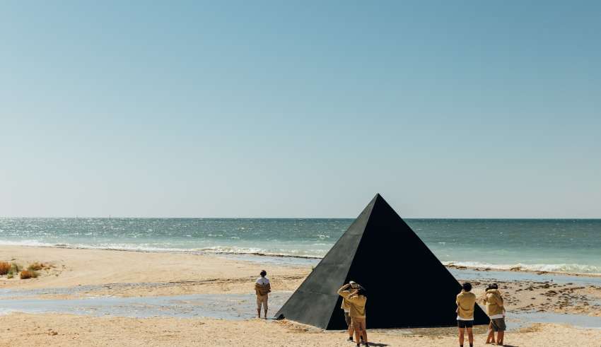 The eight fans – dubbed the ‘Astronome Domine 8’ – arrived on Mcleods Beach this morning to witness a giant black pyramid framed by the horizon, constructed with creative oversight from the group’s long time Creative Consultant and Hipgnosis co-founder, Aubrey ‘Po’ Powell. Following a Welcome to Country by elder Hazel Walgar, the eight commenced the once in a lifetime listening experience as the shadow of the moon grazed the tip of Western Australia – the best land-based place in the world to view the eclipse.