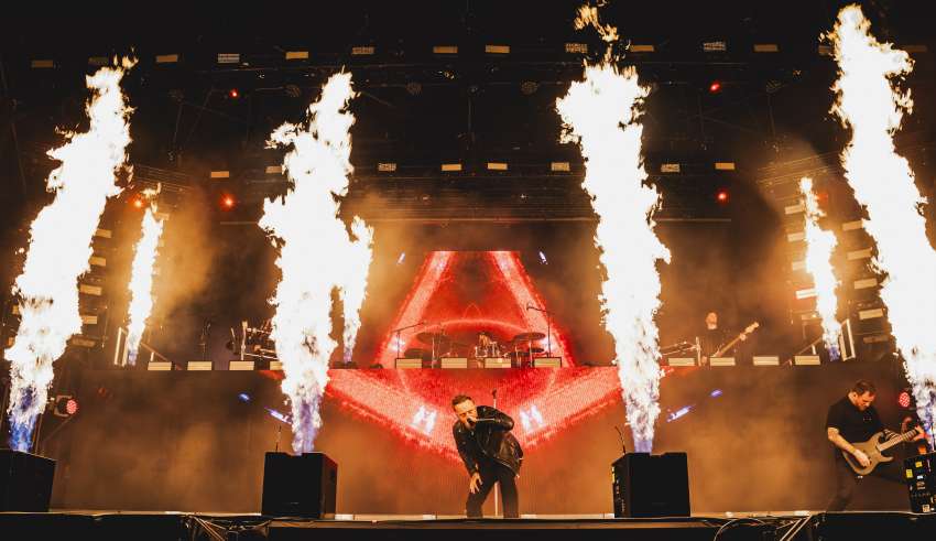 With darkness shrouding the Dio stage after an intro of Queen’s Dont Stop Me Now, echoes of shimmering synths rang out before silhouettes form on stage and opening launcher Seeing Red blisters through the air.