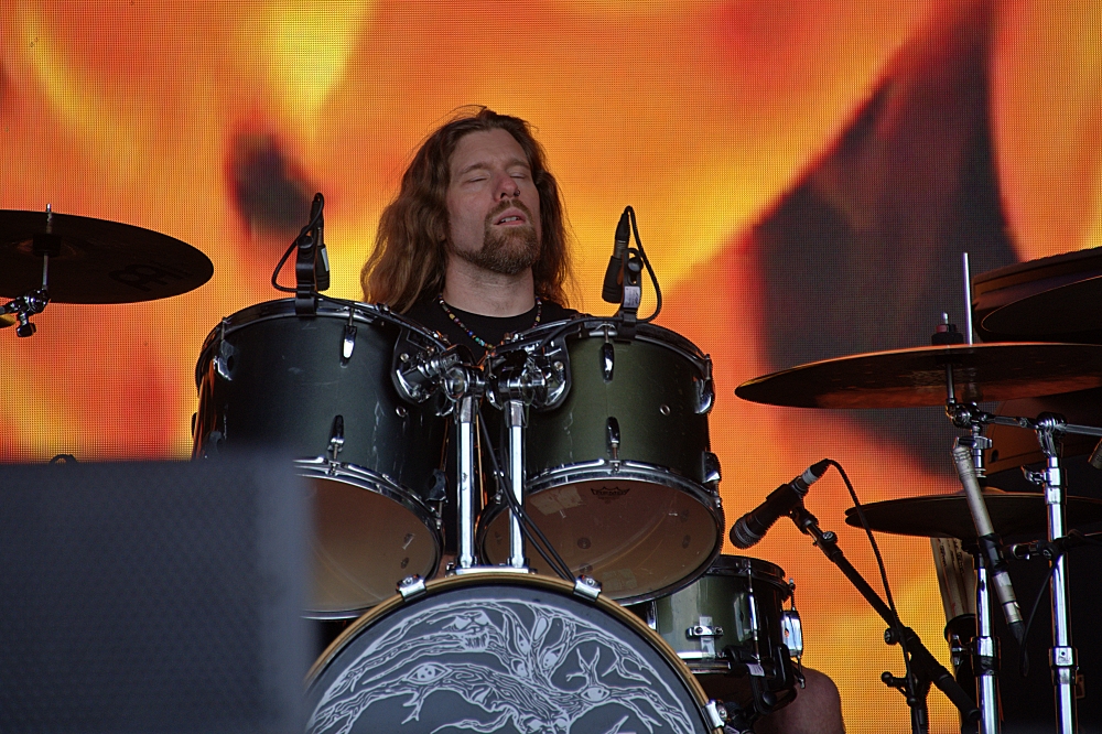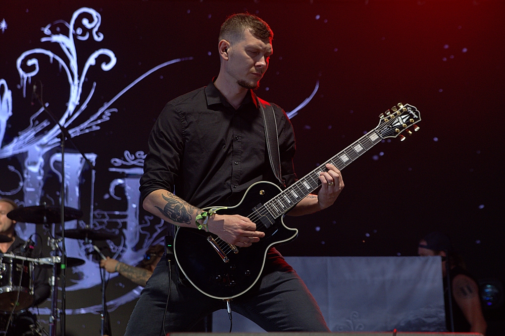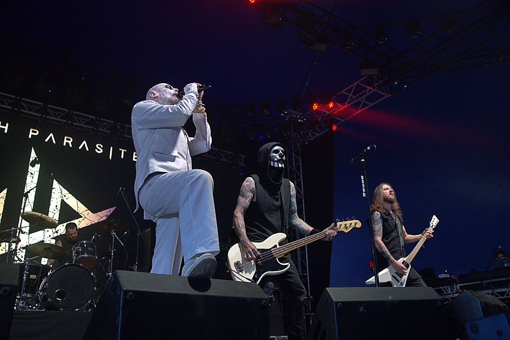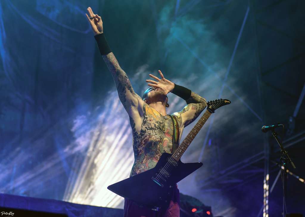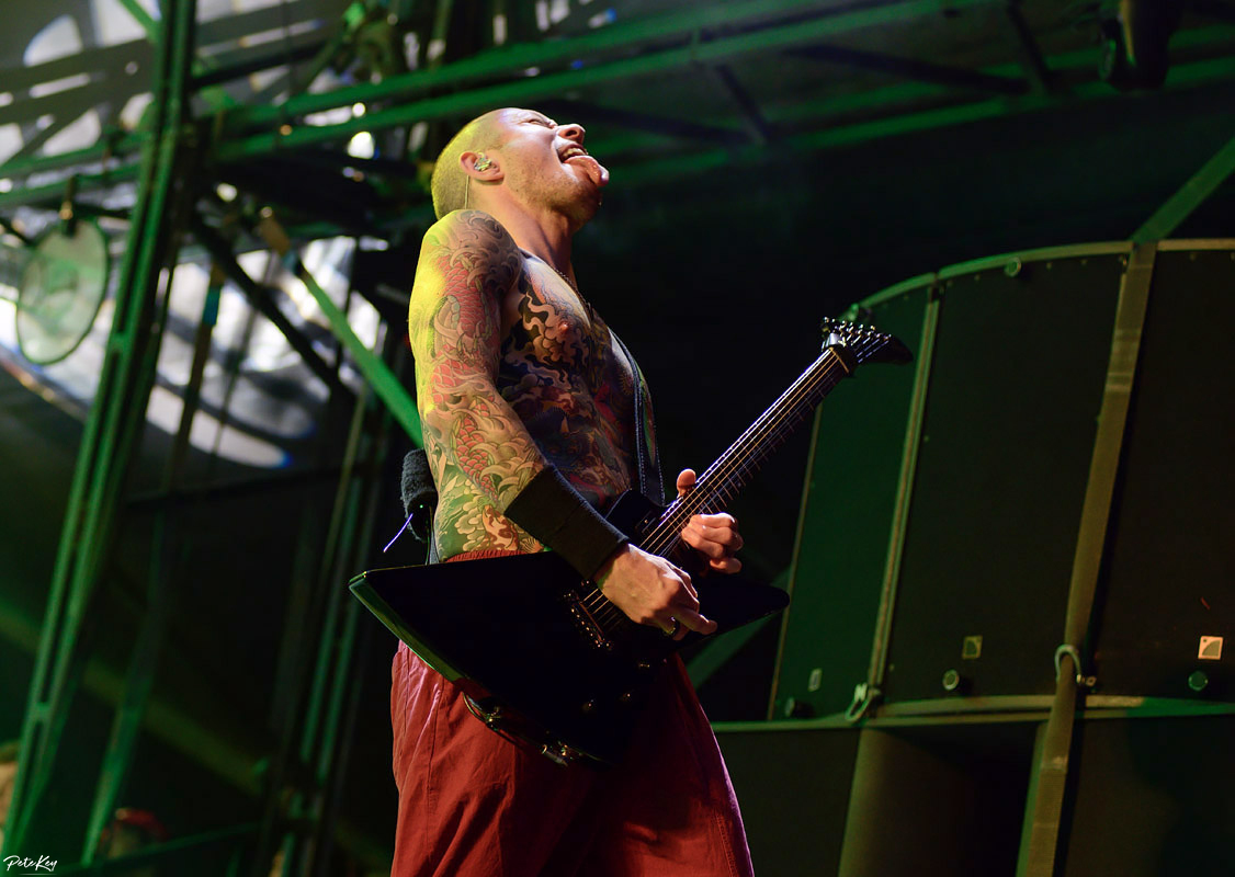Friday headliners here at Bloodstock ten years ago Floridian metallers Trivium have returned to the banks of the Trent with an absolute smorgasbord of goodies most worthy of their headlining status. Pyrotechnics aplenty (enough to give the local fire brigade nervous jitters), an inflatable interpretation of the ‘Ascendancy’ artwork, a lengthy rap-sheet of guests that is very becoming of rock royalty, a couple of tasty high-grade metalliferous covers and an unadulterated barrage of band classics from a ten-album strong arsenal.