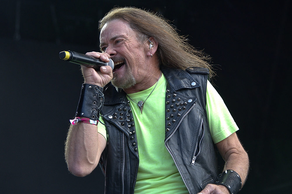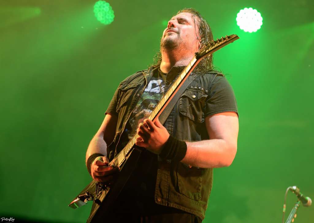 Knutson surges forth banshee-like a minute into the warp-speed Sabbath of set-opener ‘Hammerhead’, drawn from 1986’s debut ‘Doomsday for the Deceiver’, with a ferocious bite. An exuberant presence he air guitars and drums his way through the opening number. The ultra-pacy NWOBHM based thrash has, by now, drawn an extremely healthy sized crowd afront the main stage.