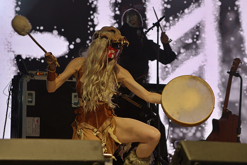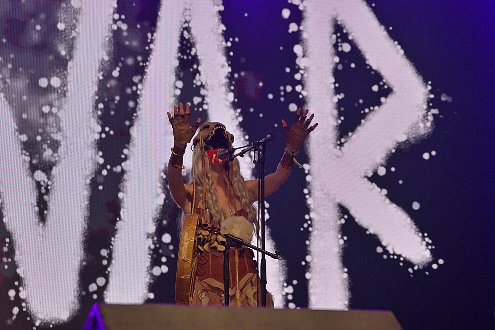 With little idea as to the track titles I can only describe what follows in the next 40 minutes as pure and unbridled chaos. Asrunn whirls and sings like Enya on steroids whilst her compatriot Mark remains resolute in the shadowy realms of the back of the stage. There’s little live instrumentation but somehow their performance is utterly compelling sweeping all along in a tsunamic wave of Scandic war cries.