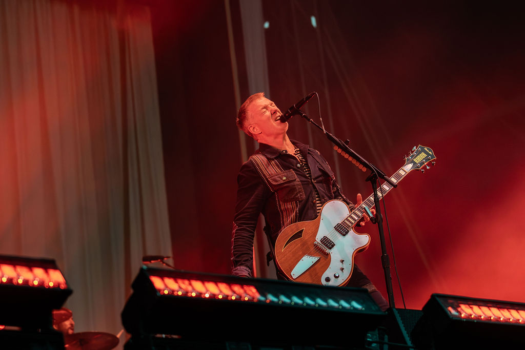 Van Leeuwan introduces us to ‘My God Is the Sun’, with the vigorous shaking of his maracas whilst holding his guitar with his left hand with great composure unlike us as we begin jumping and swaying waiting the opening riff and drums. QOTSA are known for mixing up the setlists and hopefully tonight’s performance will be no different. ‘Made to Parade’ which the lads most certainly are, sees inflated 3 & 7 balloons drifted away into the evening sky. Unfortunately, the track was not played but a poignant moment nonetheless. Again Homme shares their love of Ireland and suggests that we all “go fucking crazy”. Fertita provides the almost sinister opening keys, followed by Theodore pounding the drums all the while Van Leeuwan and Homme woo us with the punky chords of ‘Misfit Love’. The atmosphere is electric as we groove along to the punchy beat. Homme introduced ‘I Sat by the Ocean’ as a love song followed by the provocative ‘Little Sister’.