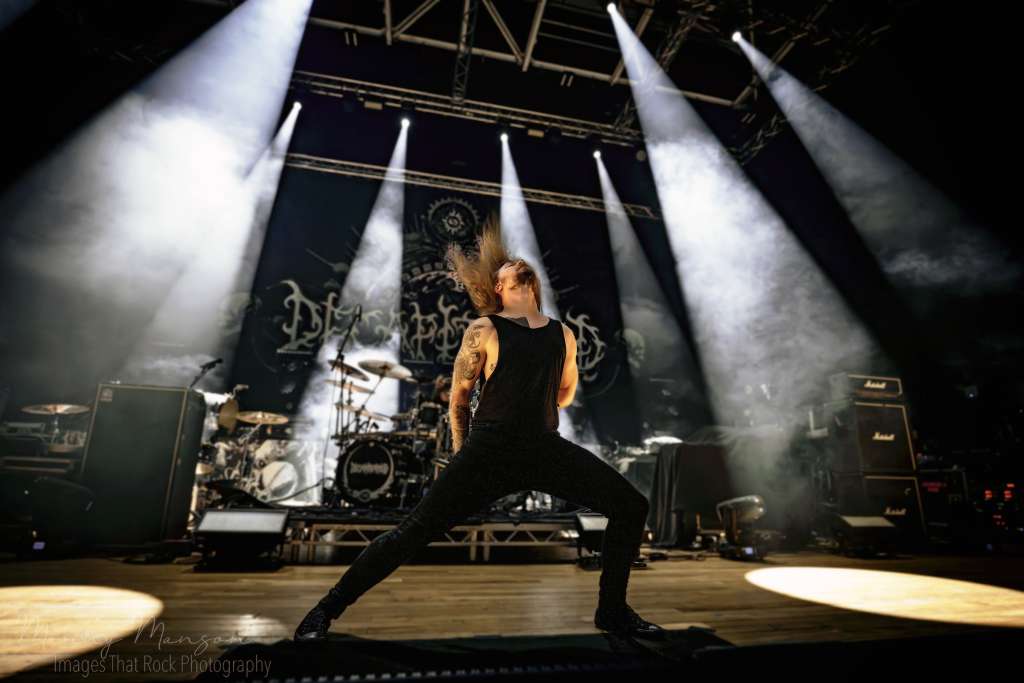 They opened live with “Strength of the Mind” (Incarnate, 2016), the riffs tight, the drums thunderous, the bass low and punchy. Smoke swirled, lights of orange and blue slicing through the haze, highlighting faces in the pit like carved statues. Crowd surfers were already flying over the barriers, a river of human bodies catching and passing each other, security moving like dancers in the chaos. Jesse prowled the stage, every word commanding, gesturing to the crowd as though pulling the energy out of their veins, threading it into the music. Adam and Joel were a study in synchronicity, riffs traded back and forth, solos leaping and spiralling, stage left and right communicating without words. “Rose of Sharyn” (The End of Heartache, 2004), followed, the first real fan-favourite singalong. The melodic yet crushing intro riff set off a surge of headbanging.