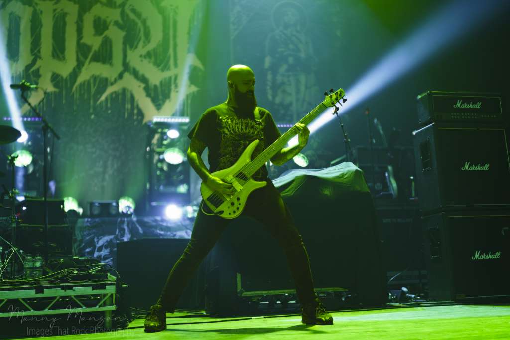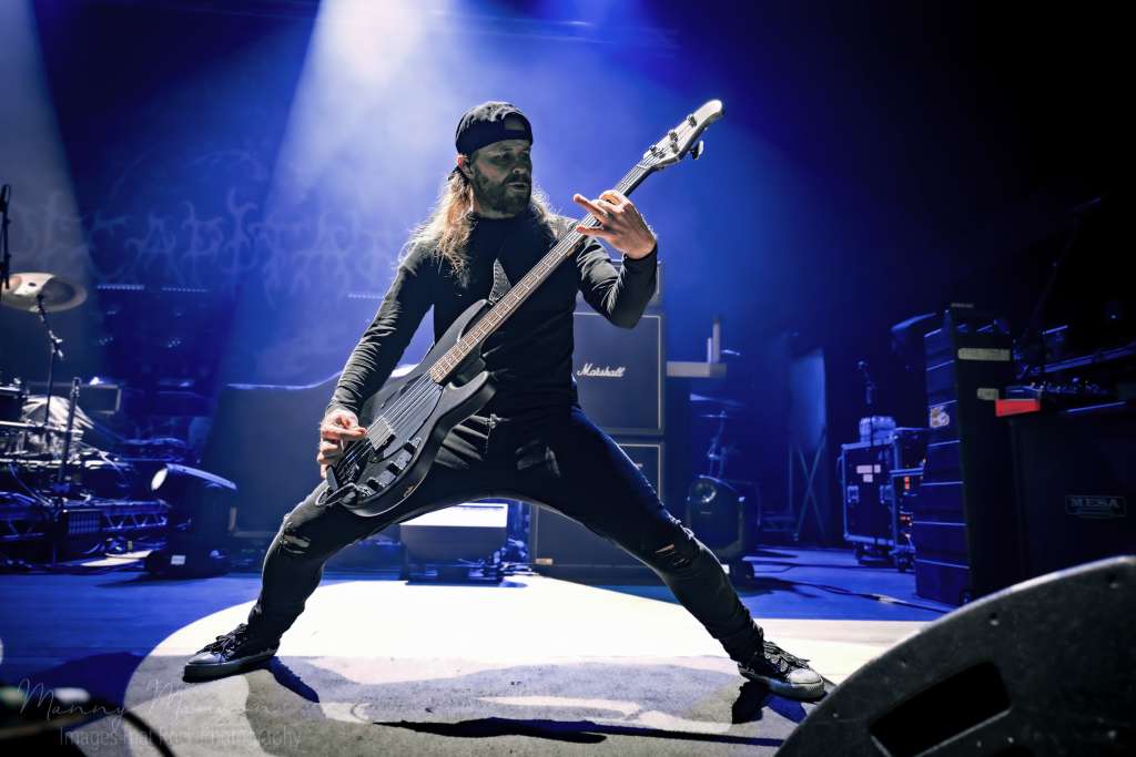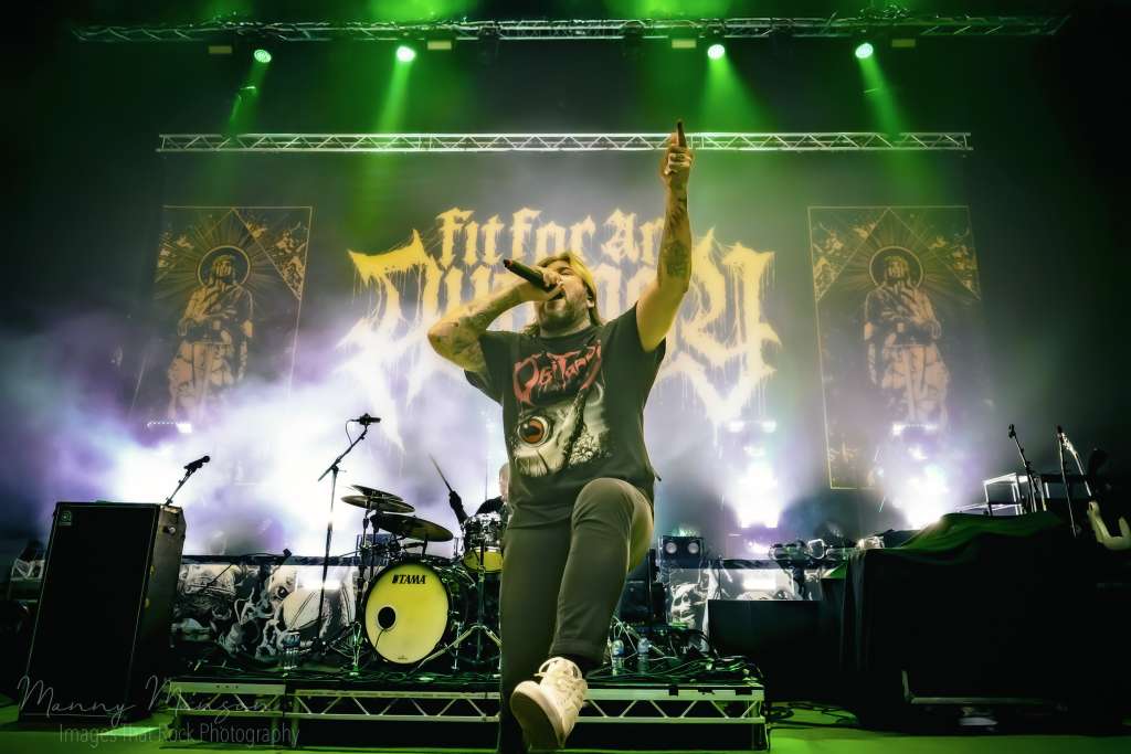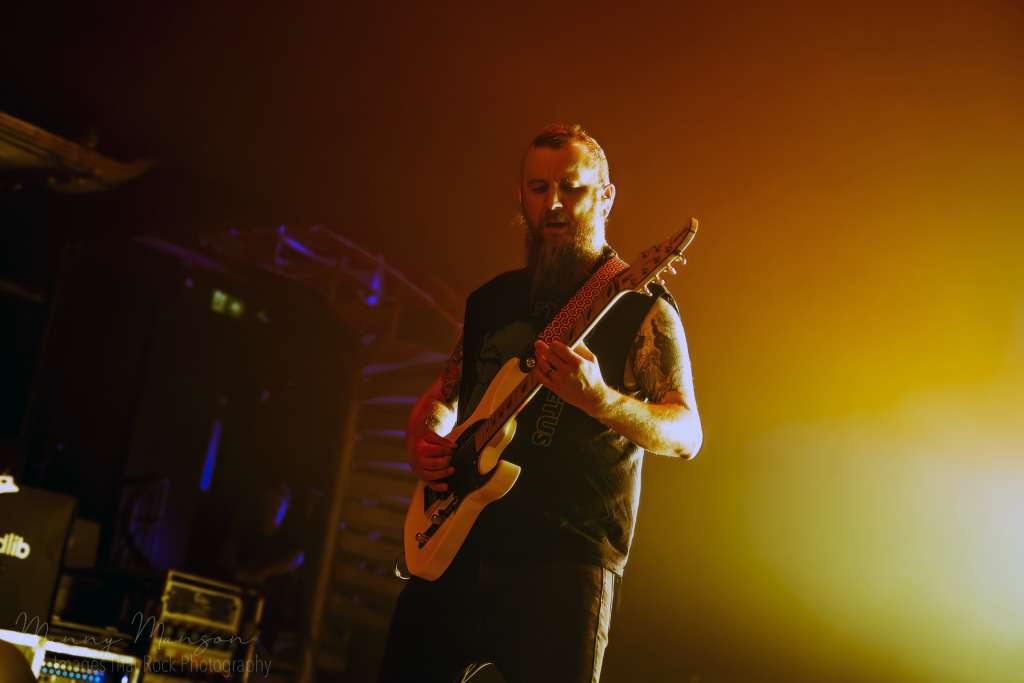 Jesse’s vocals shifted seamlessly between guttural growls and soaring clean lines, Adam’s guitar weaving tension, Joel backing with harmonics and rhythm precision, D’Antonio’s bass hammering the floor. Crowd surfers now were almost constant, vaulting over barriers in waves, thick and fast, (A new venue record surely), as the band fed off it, their performance intensifying with everybody that hit the floor. Then “Aftermath” (This Consequence, 2025), from the new album, slowed the pace slightly, an atmospheric breather but no less heavy. Jesse’s clean vocals soared above the swirling smoke, the lights softened into blue and green hues, creating a spectral effect over the Hall’s. The pit, while slightly calmer, moved as one unit, almost a living organism. The song’s layered textures, subtle melodic lines beneath crushing rhythms, gave space for fans to scream, breathe, catch up, before the band would launch into the next storm.