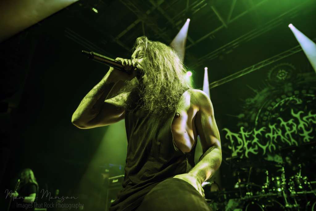 They opened with “Lower Purpose” from The Nothing That Is (2024). The riff cut like a scalpel, tight and surgical, yet somehow monumental. Each note Sheridan and Howley played seemed to echo off the ceiling, bouncing around the Hall’s, while Badolato’s guttural voice carved through it all. He prowled the stage, pausing mid-verse to gesture to the crowd, letting the audience’s own growls carry through the song’s breakdowns. Smoke hung low, swirling around the risers, the green and blue lighting picking out faces in the pit like ghostly masks. Crowd surfers started appearing thick and fast now, some cautiously at first, others hurled into the air like practiced athletes. Security moved with precise choreography, letting bodies ride the chaos, lifting some gently while bracing for the next wave.