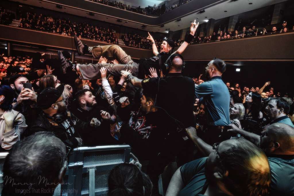 The crowd were already buzzing, long before a single note rang out. The Halls felt tight, almost claustrophobic with anticipation, the smell of sweat and metal filling the air. Fans had edged forward toward the barrier; you could sense that the pit already simmering like a cauldron ready to boil over. The lights dimmed, and a slow hum of anticipation rattled through the Hall’s. Then came the taped intro, “From the Nothingness With Love” eerie, atmospheric, an ominous herald that shook the floor beneath you. A smoky haze curled around the stage edges, red and violet washes cutting across the audience like warning signals.