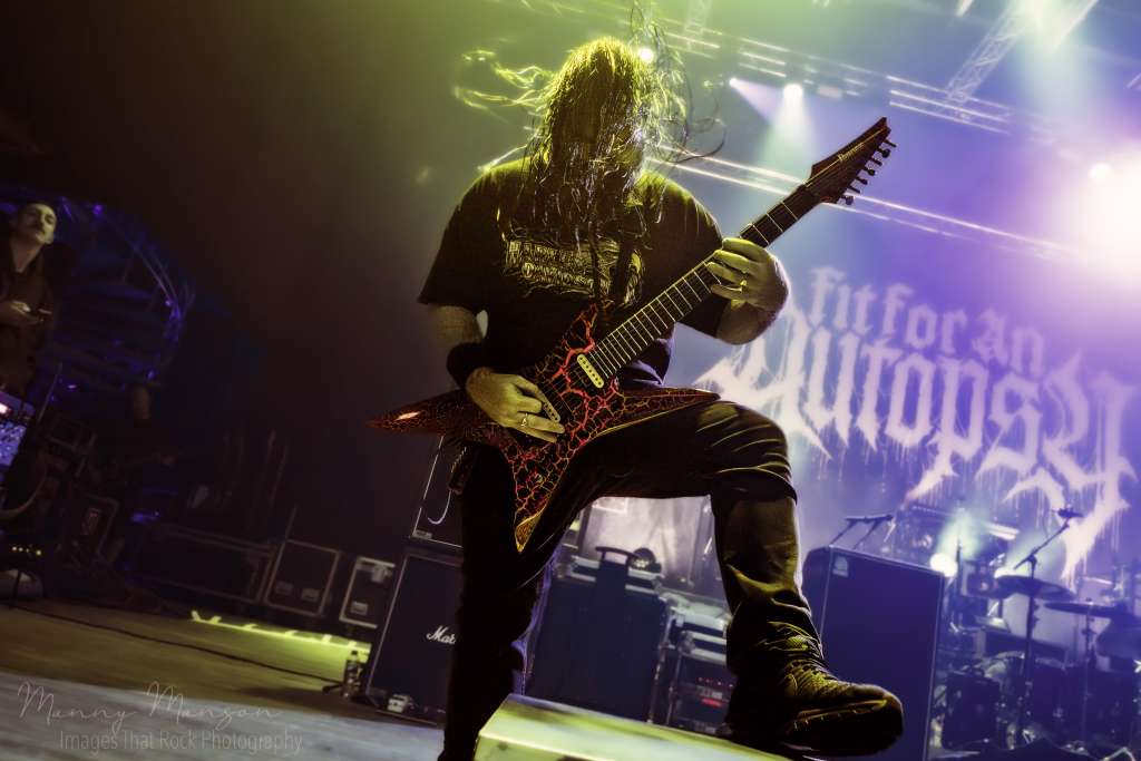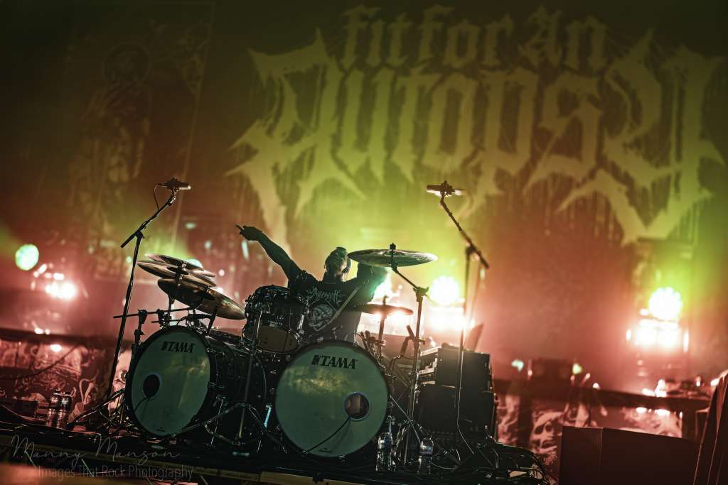 The tech crew swarmed, flipping risers, swapping monitors, and as the last fog rolled out, the crowd was already leaning forward, knowing the next wave of intensity was coming. The green and blue lights of Fit For An Autopsy began to hum, and the pit, still recovering, braced for the next assault. The Hall’s barely had time to catch its breath before the first ominous growl of Fit For An Autopsy ripped through the smoke-filled stage.