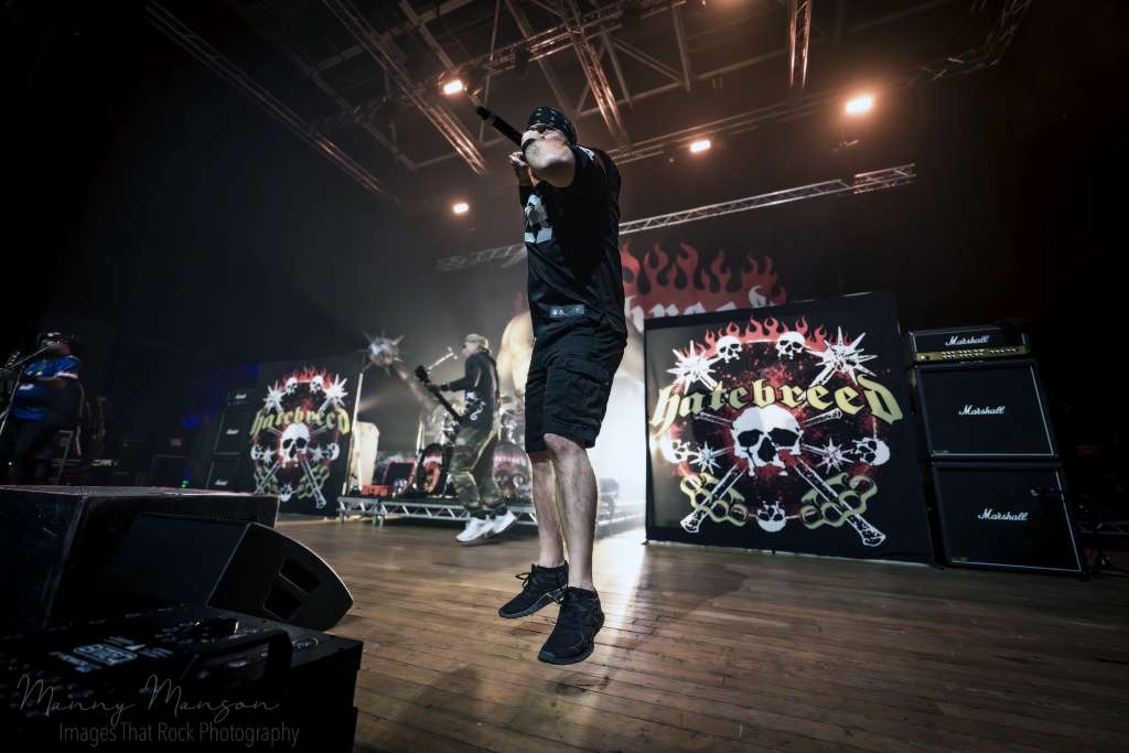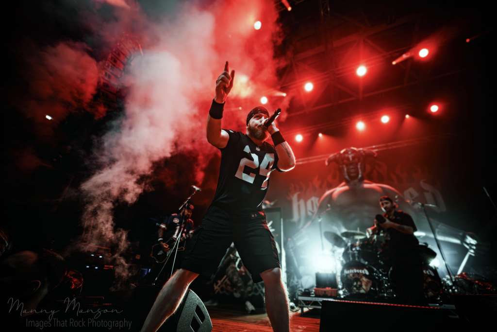 As the last note died, the Hall’s hummed with residual tension, the pit still heaving, fans catching their breath, sweat dripping, eyes wide from immersion. The transition began almost immediately, the smell of smoke and sweat lingering, the stage reset, drum risers swapped. The audience barely had time to settle before the low hum of Hatebreed’s taped intro began, a new wave of chaos building from the far side of the Hall’s. Fit For An Autopsy’s chapter had ended, leaving the crowd primed, restless, and ready for the next assault, the pit heaving, bodies tangled, sweat dripping, adrenaline pumping, when the first heavy strains of Accept’s “Balls to the Wall” hit through the speakers. The smoke swirled low along the floor, lights cutting jagged streaks of red and orange through the haze, and the crowd responded instantly. It was a call to arms, a warning that Jamey Jasta and his Connecticut hardcore machine were about to descend.