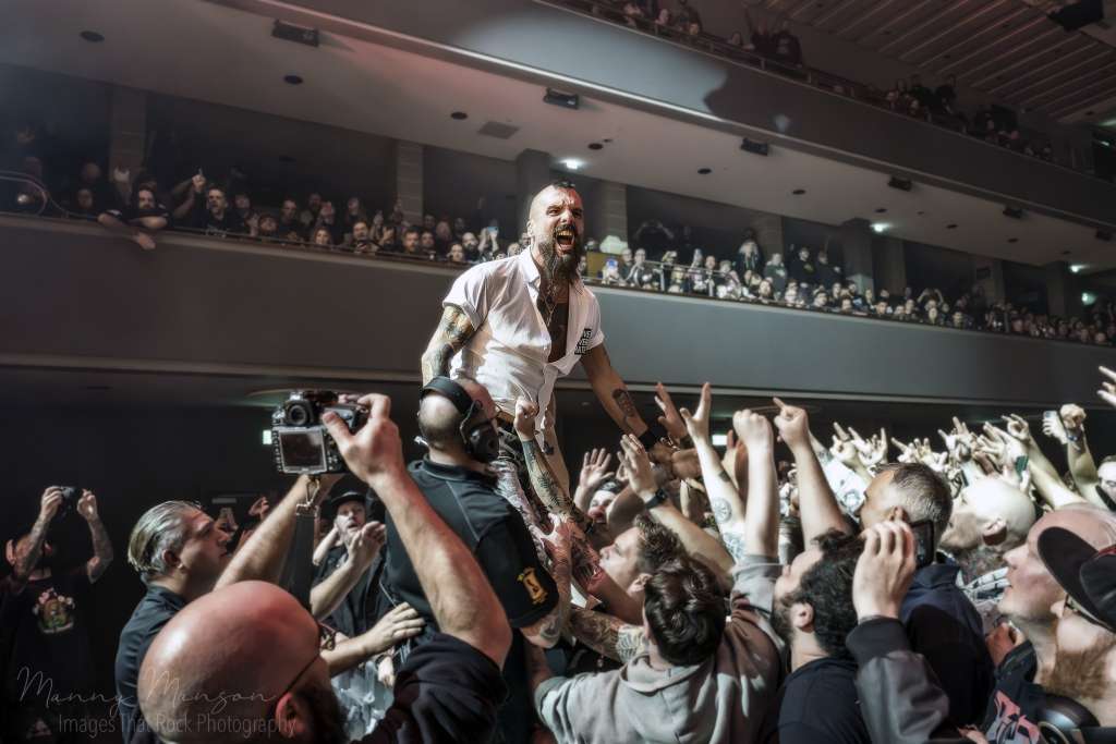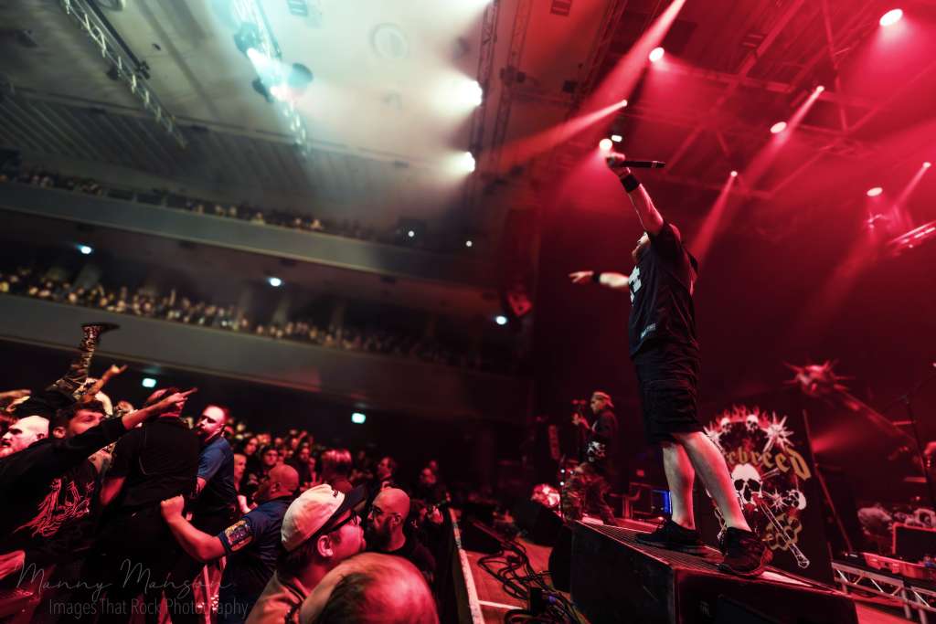 “This Is Now”, (The Rise Of Brutality), pushed the Hall’s further. smoke curling through coloured lights, red and orange streaking across every flailing arm and flying body. The pit was relentless, thick with surfers, the chaos almost physical in its density. Every riff by Frank and Wayne, every drum fill by Byrne, was mirrored by waves of motion in the audience. “Smash Your Enemies”, (Under The Knife), escalated to nearly unmanageable intensity. Crowd surfers sailed like projectiles over the barrier, sometimes landing mid-pit only to be lifted again in rhythm with the breakdowns. Jasta barked commands, letting the audience scream choruses back, pacing the energy like a master conductor. Guitars sliced through the thick smoke, bass hammered low, and every drum fill punctuated the chaos, escalating it further.