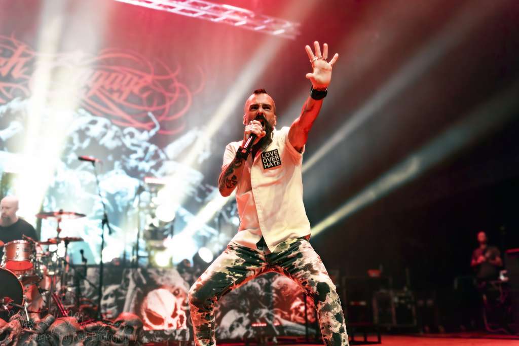 They opened with “I Will Be Heard”, (Perseverance), and the pit detonated instantly. Crowd surfers were thick and fast over the barrier, arms catching, bodies propelling others, creating waves of controlled chaos. Jasta prowled the front of the stage, leaning into the barrier, letting the audience roar the chorus while he spat the verses with venomous intensity. Every drum fill, every guitar accent was mirrored by the pit, creating a perfect feedback loop of aggression and release. “Make the Demons Obey” hit next, riffs precise, yet heavy with a groove that demanded movement. Jasta’s vocals shifted seamlessly from barked aggression to shouted anthems, mic technique raw and commanding. The pit surged with each breakdown; bodies flew over barriers, caught and lifted again, the floor vibrating with stomps. Frank and Wayne’s guitars interlocked during the bridges, harmonics stabbing through smoke, each note punctuated by Byrne’s relentless fills.