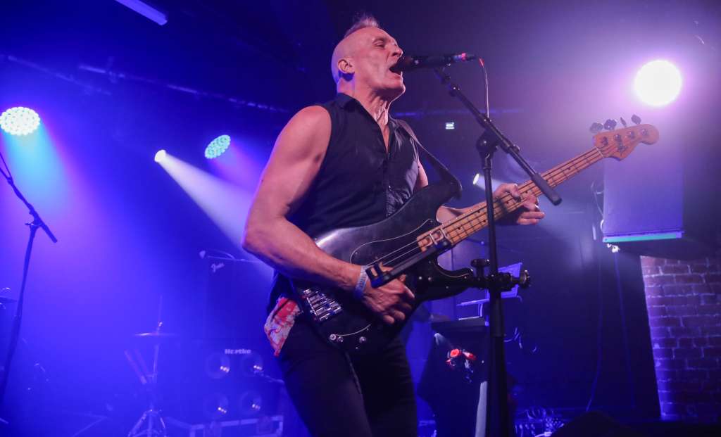 He is also a very fine musician and took command of the stage with a captivating performance that saw him coming perilously close to poking several members of the front row with the business end of his bass guitar. There is no doubt that he had the Belfast crowd eating out of his hand and the biggest cheer was reserved for the news that The Membranes are in the process of recording a new album. Job done The Membranes filed off the stage and after a brief reorganisation of the drums and cables the set lists were taped to the floor and on came Scotland’s finest; The Skids. Richard Jobson’s huge grin and acknowledgement of the fans set the scene for a great evening of quality old school punking. The crowd surged forward and I felt lucky to have captured a prime spot up against the barrier right under the imposing figure of bass player Peter Byrchmore. Earning his wages that night Peter had also played with The Membranes earlier.