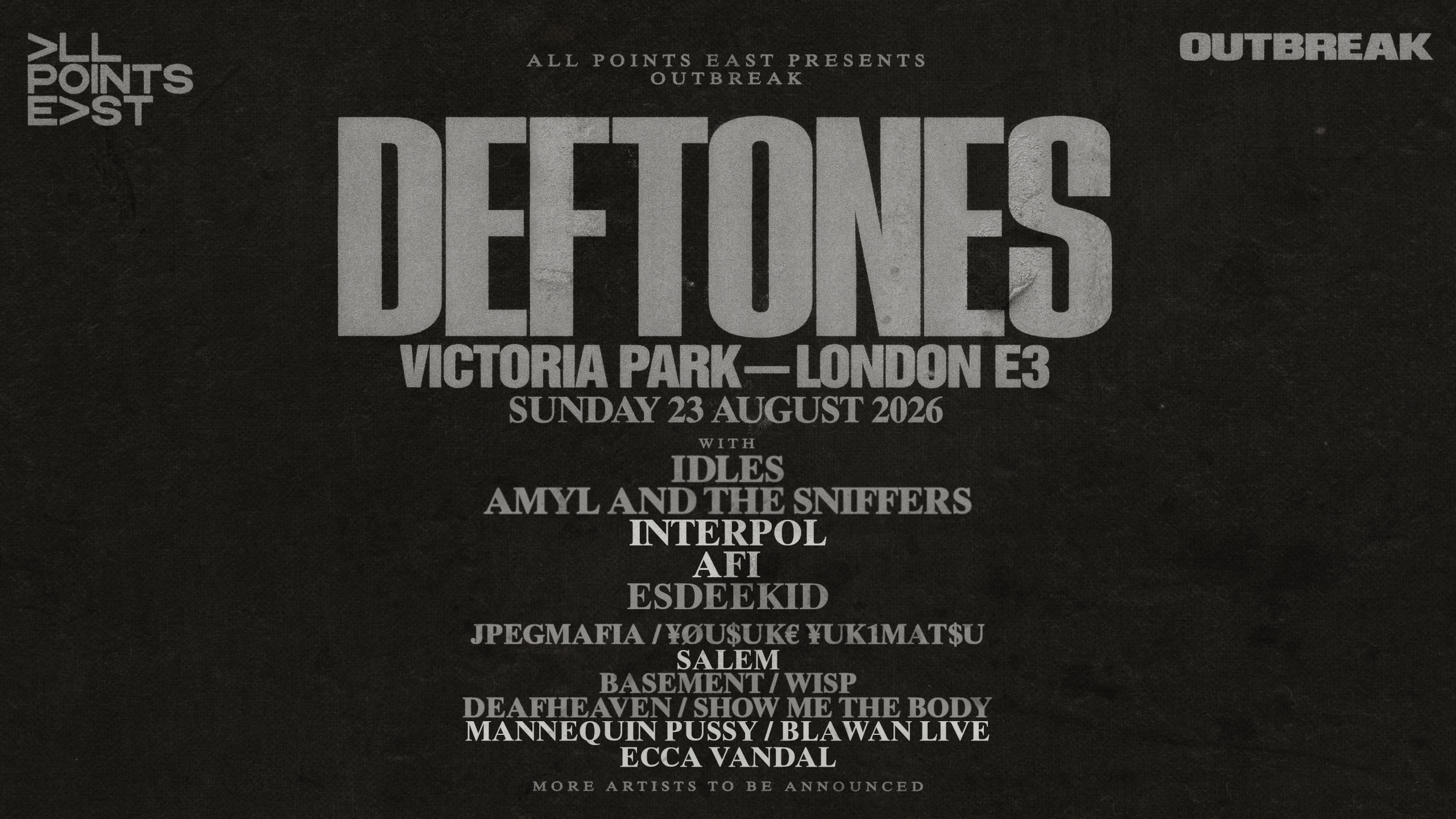 Today, All Points East and Outbreak Fest announce Deftones will be joined by special guests Interpol, as well as AFI, Salem, Mannequin Pussy, Blawan (live) and Ecca Vandal. Previously announced acts include IDLES, Amyl & The Sniffers, EsDeeKid, JPEGMAFIA, ¥ØU$UK€ ¥UK1MAT$U, Basement, Wisp, Deafheaven and Show Me The Body, with more to be added.
