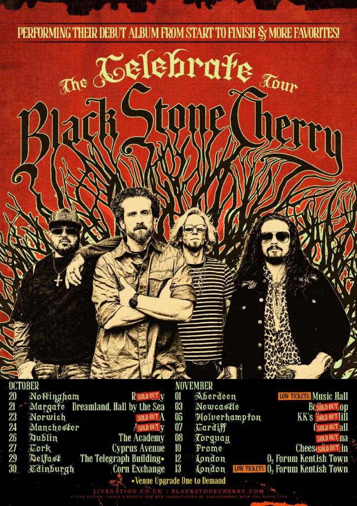 BLACK STONE CHERRY recently shared plans for a massive headline tour of the UK lasting nearly a month. The special ‘An Evening With’ shows will follow their recently-announced EU tour, and will call through Nottingham, Margate, Norwich, Manchester, Dublin, Cork, Belfast, Edinburgh, Aberdeen, Newcastle, Wolverhampton, Cardiff, Torquay, and Frome, before culminating in two shows in London. The evening will include two separate sets from the southern rockers, playing their legendary 2006 self-titled debut LP in full (marking its 20th anniversary), and a second set of long-time classics and new songs off the brand new EP, Celebrate.