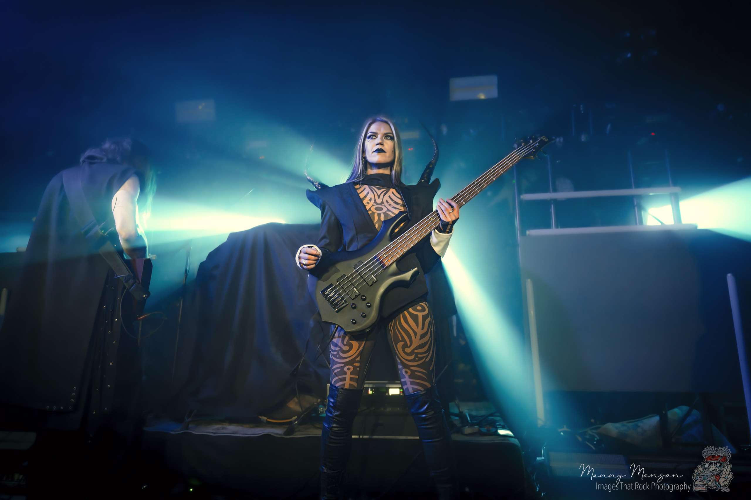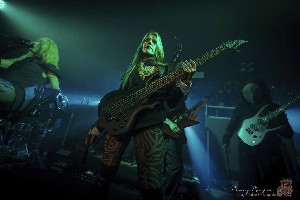 “All Is Taken,” from Black Spikes’ 2021 release, wasn’t just the next track, it was a surge, a pulse that turned the atmosphere from entranced to urgent. Agni opened with low, almost predatory vocals, her phrasing deliberate, each word carrying the weight of the band’s Baltic-infused intensity. The guitars, Yaga’s masked, hooded presence still dominating stage right, Mazvis countering on the left, created a jagged dialogue, riffs tight but interlaced with airy harmonic touches that floated above the rhythm section. Sime’s bass anchored the chaos with a solid, growling undercurrent, and Titus’ drums alternated between precise tribal fills and hammering grooves that felt both mechanical and organic at once.
