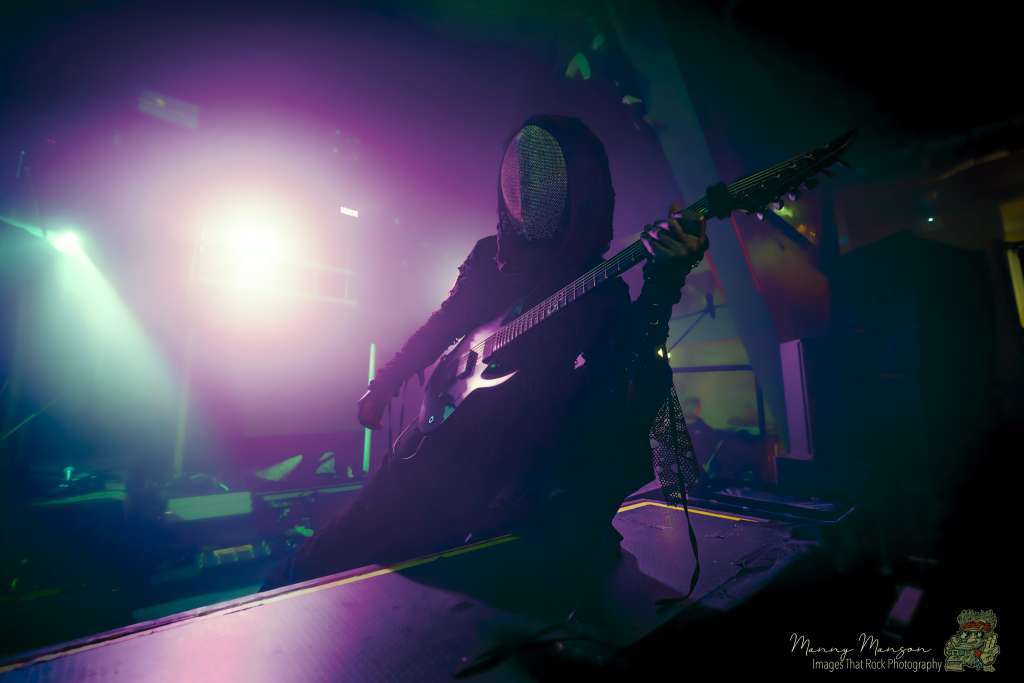 They’re ready. Black Spikes didn’t so much walk onstage their set didn’t suddenly explode into life, it crept in, tension building in the low end before the first track properly revealed itself, and from that moment Black Spikes weren’t just playing, they were constructing something in real time. Agni stood motionless at first, centre stage, her presence almost unnerving in its stillness, and when her voice finally cut through it wasn’t immediate power, it was control, measured and deliberate, drawing the room inward before unleashing something far more serrated. Yaga, to her right, already looked otherworldly, that hooded cape swallowing his frame while the fencing mask reflected fractured shards of light, turning every movement into something half-seen, half-imagined. His guitar tone followed suit, textured, cutting, but never clean in a conventional sense, while Mazvis on the opposite side grounded everything with a tighter, more direct attack, the two guitars working like opposing forces pulling the track in different directions without ever losing cohesion. Sime’s bass sat thick in the centre of it all, not flashy but absolutely essential, filling space and weight, while Titus drove the song from behind with a restrained but undeniable force, every kick drum landing like a controlled detonation.