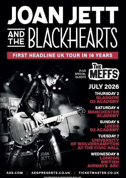 The July 2026 tour will see Joan Jett And The Blackhearts playing legendary hits like ‘I Love Rock N’ Roll’, ‘Bad Reputation’, ‘I Hate Myself For Loving You’ and many more on their first UK headline tour in 16 years. They will take to the stage at O2 Academy Glasgow (2 July), Manchester Academy (4 July), O2 Academy Leeds (5 July), University of Wolverhampton at the Civic Hall (7 July) and finally the London British Airways ARC (8 July).
